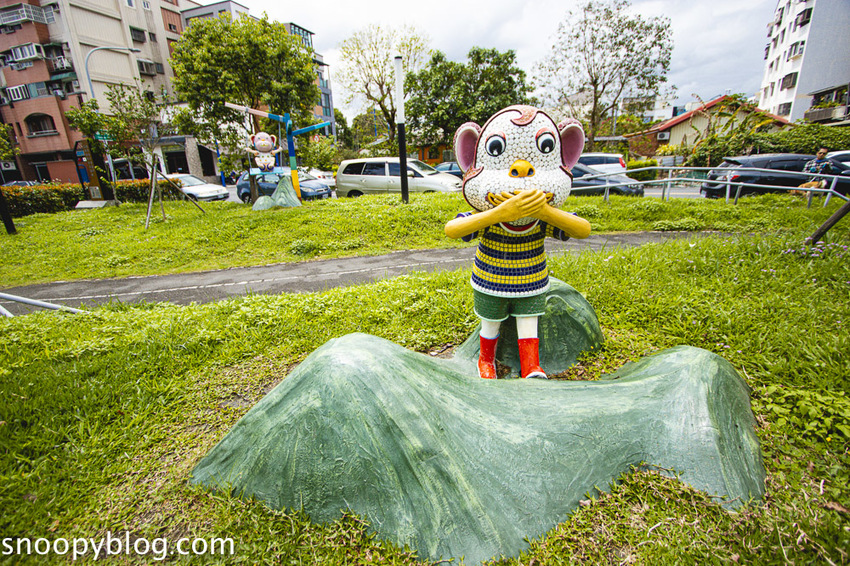 園區內設置了山丘滑梯與沙坑,還有可愛的馬賽克猴子裝置藝術,
