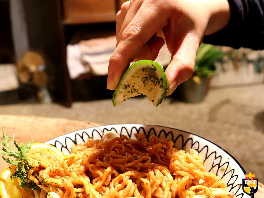 檸香辣味乾拌海鮮意麵:主食材種類跟鍋燒意麵一樣,辣度大約小辣程度,酸、甜、鹹、辣、鮮五味完美融合