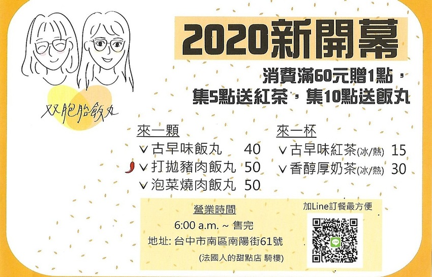 双胞胎飯丸就位在法國人的甜點店騎樓,小小一攤沒有仔細一看,就會不小心錯過的美味早餐。每日早上六點迎接大家睡眼懵懵的早晨,並給大家一個多口味的元氣飯丸唷!!