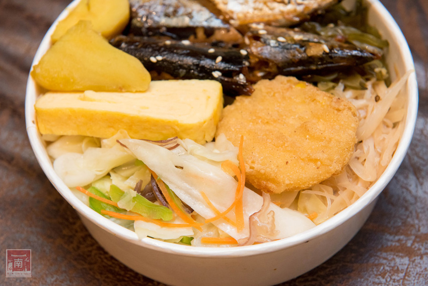 『甘露秋刀魚餐盒(80元/份)』秋刀魚便當基本上是我不會點的餐盒,因為要挑刺真的很麻煩,但這一個甘露秋刀魚我卻滿推薦點的,因為整個魚骨頭都被燉煮化開了,完全不用挑刺就可以直接吃,因為魚肉都吸收了醬汁,所以帶點甘甜香氣。搭配了地瓜、可樂餅、炒青菜、玉子燒和兩樣日式小菜。