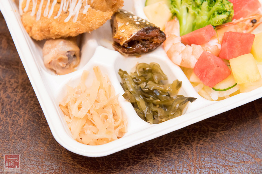 我都說這個是主廚招牌餐點,因為主餐有雞腿、炸豬排、炸蝦、甘露秋刀魚、可樂餅和油豆腐,雞腿和油豆腐吸附了醬汁,帶著味道但不會很鹹,可樂餅外酥內軟包著玉米,炸豬排不油膩也是好吃,甘露秋刀魚骨頭都化開了,完全不用挑刺。搭配炒青菜、兩樣日式小菜、地瓜、壽司和海鮮水果沙拉。