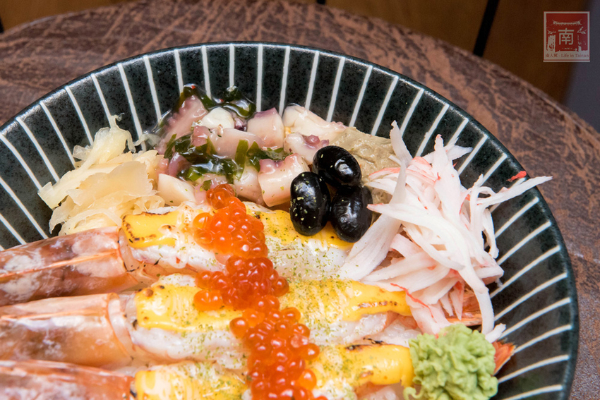 天使紅蝦起司海鮮丼也是可以外帶,是用小圓盒餐盒承裝,底層是醋飯,上頭擺了四隻生的天使紅蝦,紅蝦上頭鋪上起司炙燒再擺上鮭魚卵,鮭魚卵用嘴唇一抿就化開了,蝦子帶著鮮甜味道,肉質也很鮮美,旁邊搭配幾樣小菜,但值得介紹的是旁邊有一坨咖啡色的是蝦膏,帶著蝦子的海味。