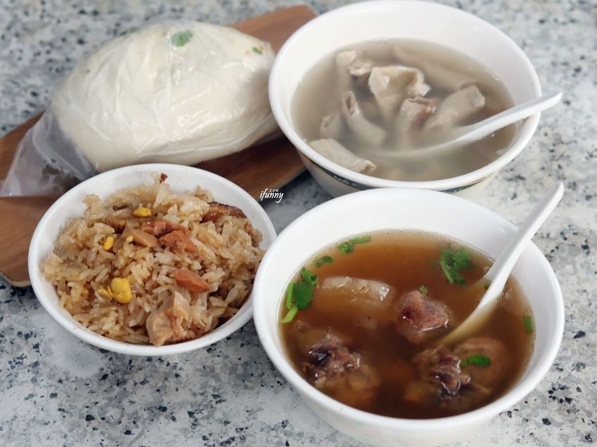 選用是台灣長糯米,其上有豬肉丁,是採新鮮豬後腿肉製成,吃來恰到好處不乾柴,其間入味的香菇也增添不少香氣,特別的是有一些碎蛋黃、蛋皮在其間,估計是滷破賣相不好的蛋,拿一些放在其上,而那滷蛋香氣跟油飯也很搭。