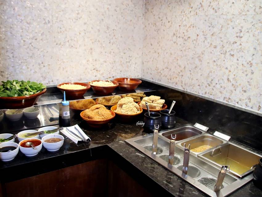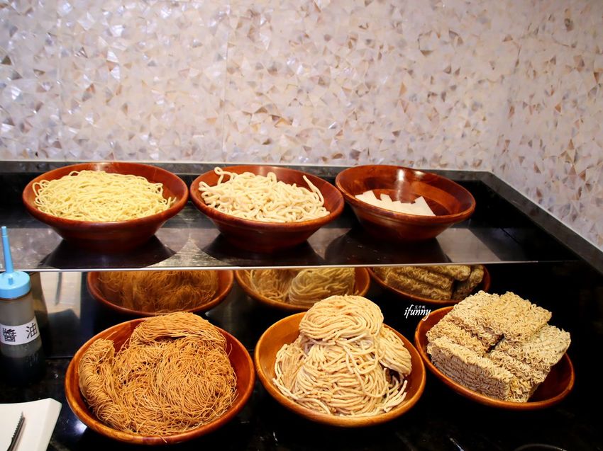 燙好的麵可以加肉燥醬或蘑菇醬,另外也可加蘿蔔湯。這天發現這樣有趣的自助式,很受年輕人的歡迎。