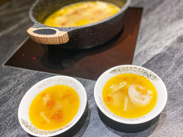 點完餐之後,詢問服務人員後介紹湯底是以玉米雞為基底的湯頭,