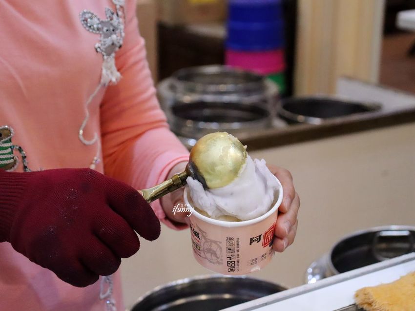點好口味後,工作人員就會用舀冰器挖出大大的叭噗。