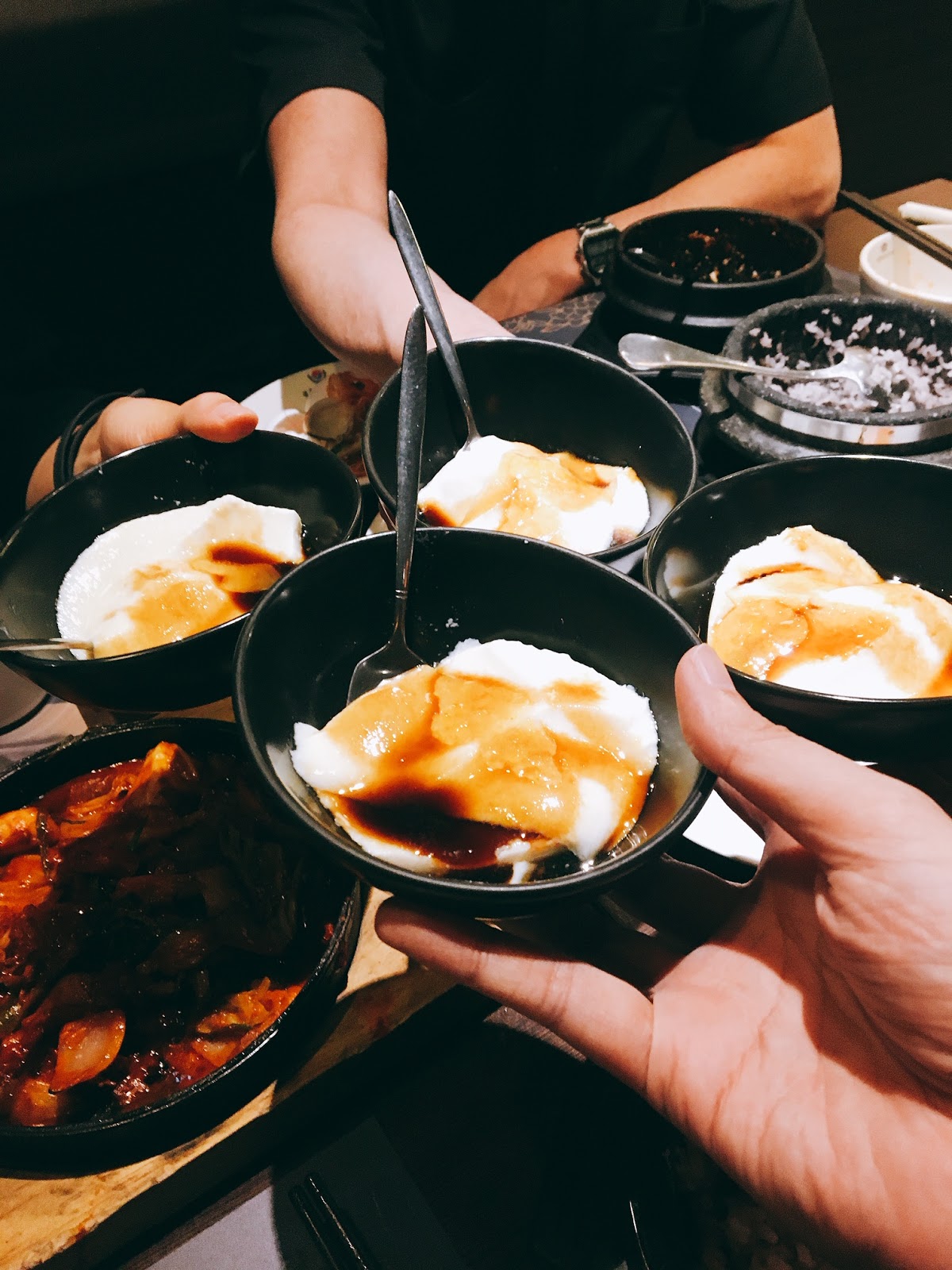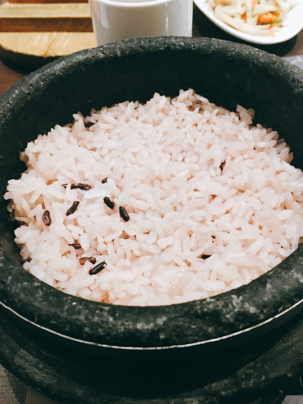 主餐是石鍋飯先上桌,帶點紫米的石鍋飯,充滿嚼勁的口感,可以包海苔入口品嘗,配上嫩豆腐煲的嫩豆腐,簡單又美味。底部還有鍋巴的酥脆與飯的香氣,冷冷的天氣吃起來真的是一種享受。