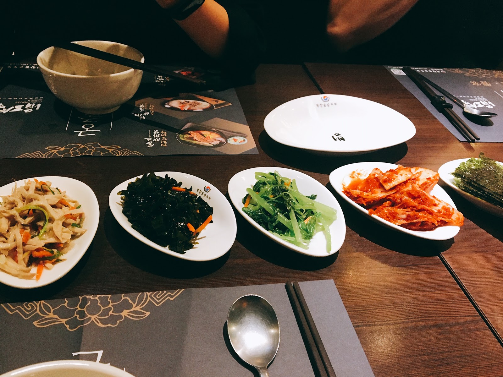 先上桌的是韓式小菜,基本盤有五盤有海苔、豆皮、泡菜、青菜、海帶芽等,會因時節而有所不同而調整搭配,這些小菜是可以無限續點的,不過我們還是以主餐為主,所以小菜並沒有無限制的一直續盤。