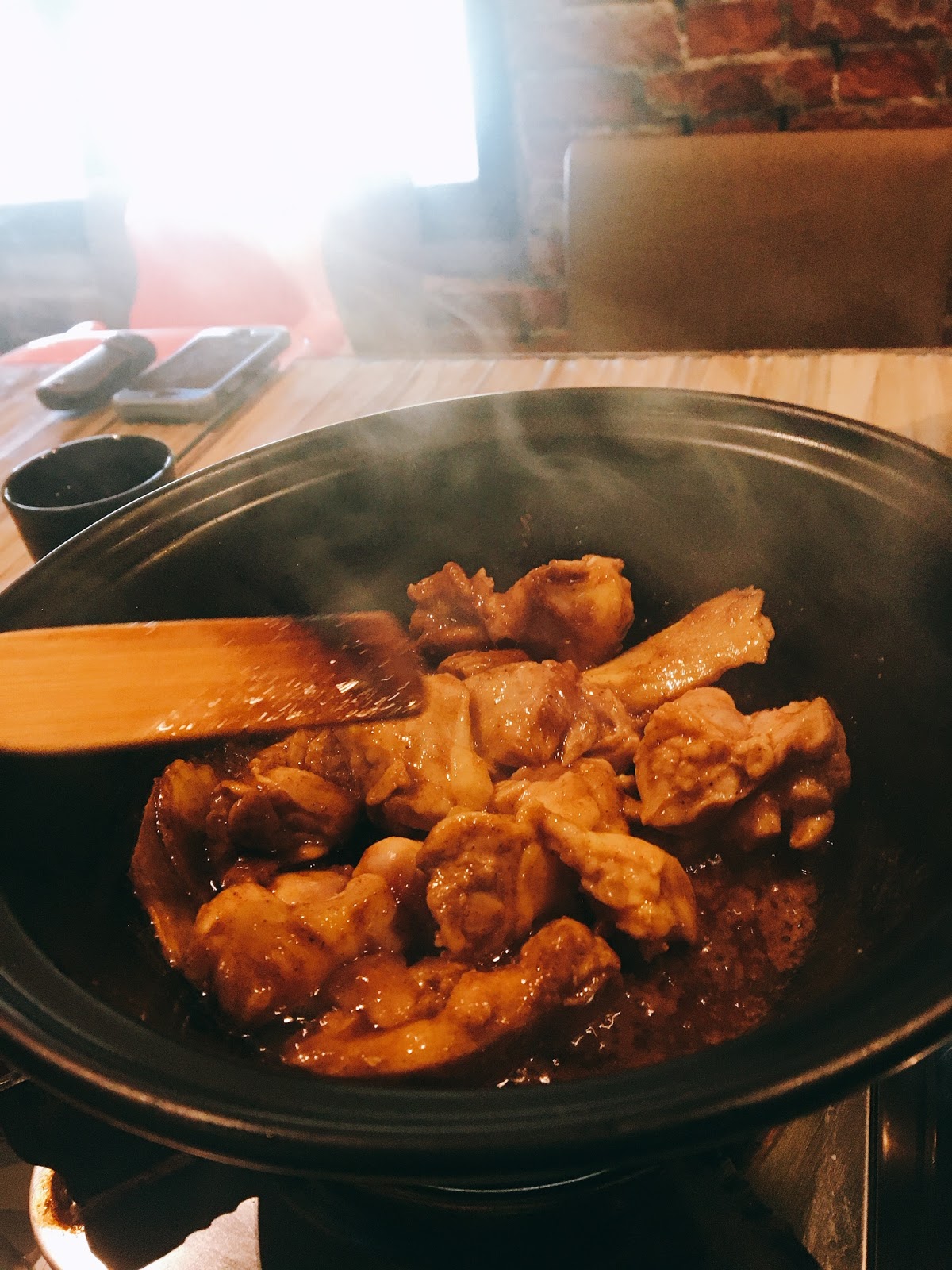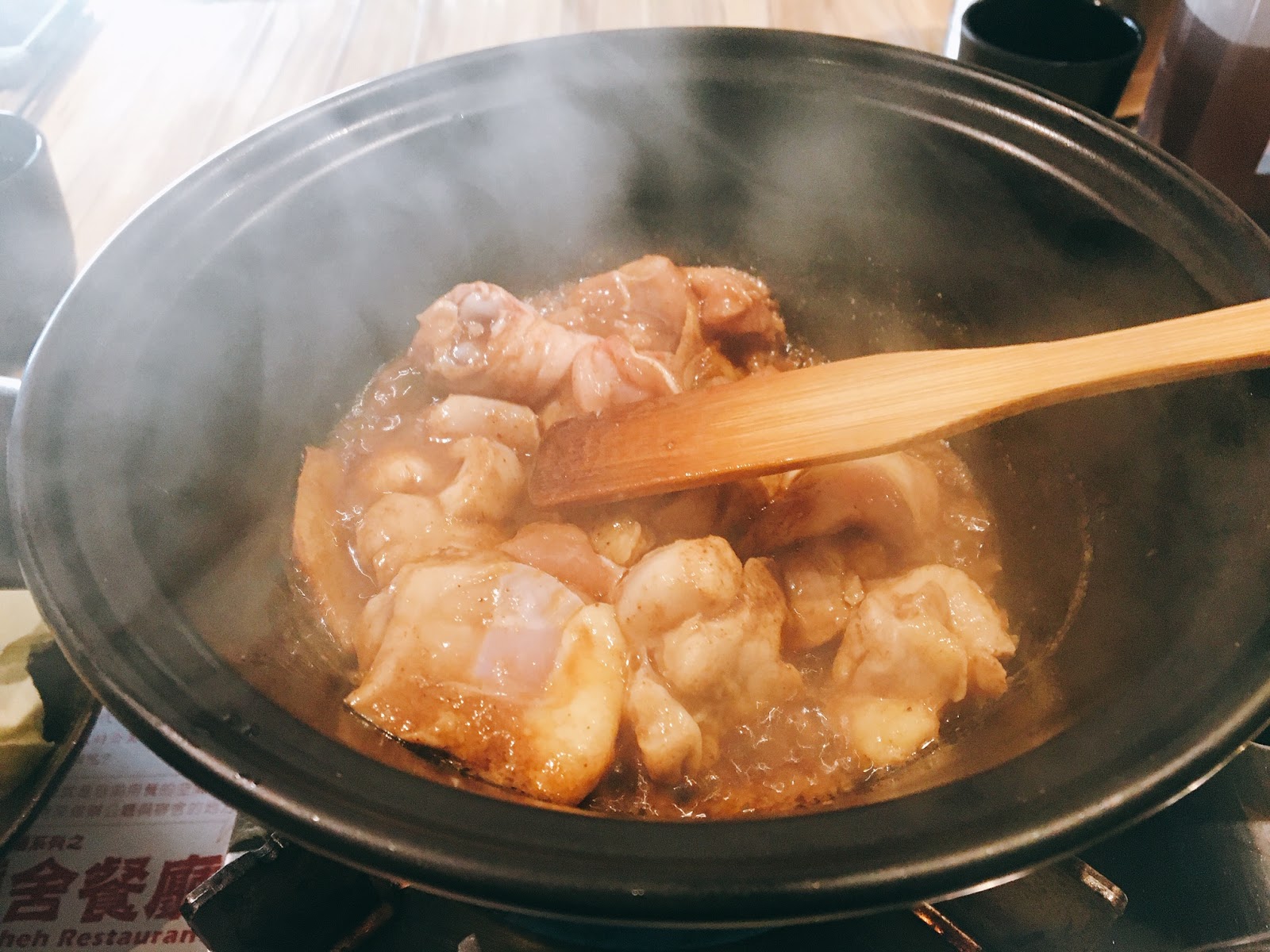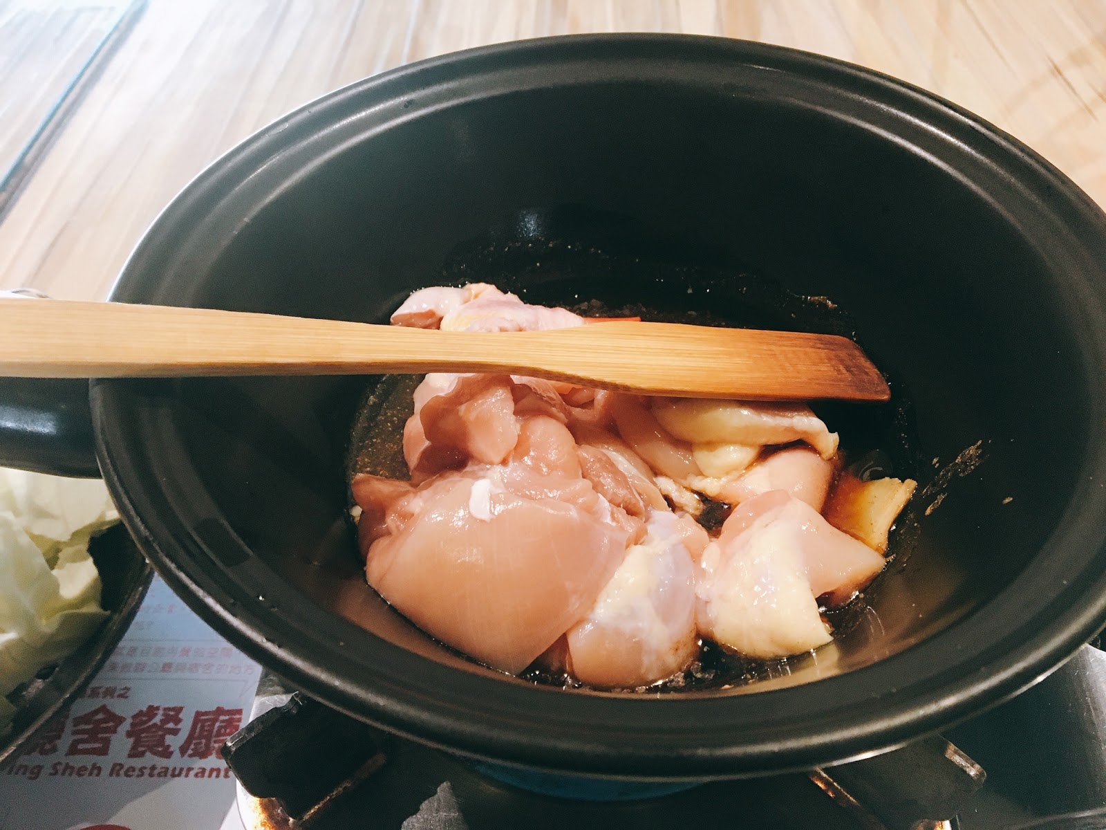 我點的是「麻油雞鍋」,我個人很喜歡這道料理,除了麻油非常香以外,另外你需要自己料理,鍋子裡面已經有調味和麻油幫我準備好了,只需要自己動手把雞肉炒熟,配料有薑片、麻油等配料,雞肉在裡面越炒越香,炒熟了之後,可以先乾吃「麻油雞」,然後再加高湯進去,變成「麻油雞湯鍋」。乾濕兩吃也是這個鍋的特色,個人非常喜歡這種雙重口感的感覺。