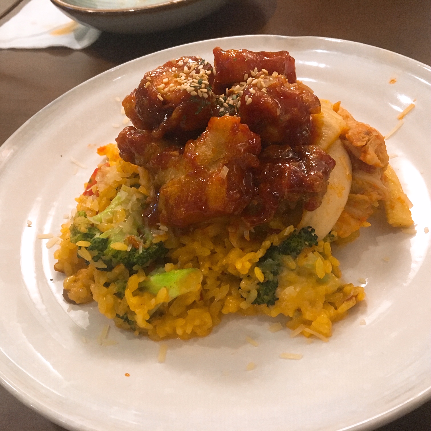 炸雞是韓式風味紅醬,吃起來不會過膩,有讓大家驚豔,而且搭配的飯也非常好吃,口感很不錯,配上泡菜也非常提味,推薦大家點這套來吃,好吃又健康。