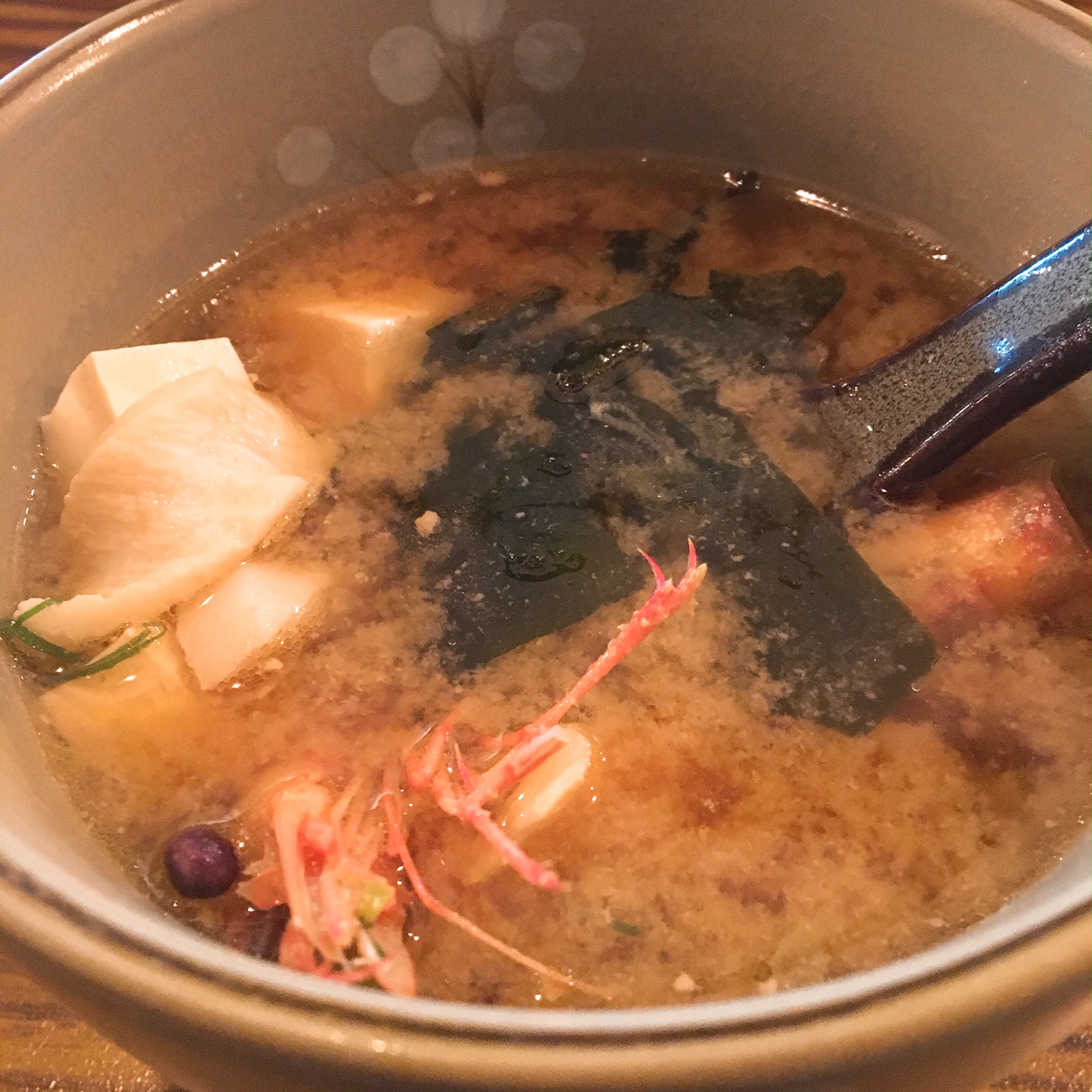 這是店家推薦的單品鮟鱇魚肝,鮟鱇魚肝其實我平常很少吃,因為它會有股腥味,我個人不是很喜歡腥味重的食物,不過澐壽司的鮟鱇魚肝蠻好吃,不但沒有腥味,吃起來還有點像吃鵝肝的感覺,油脂飽滿好入口,配上青蔥來調味,味道非常棒,我很喜歡這道單品。湯類-味噌湯