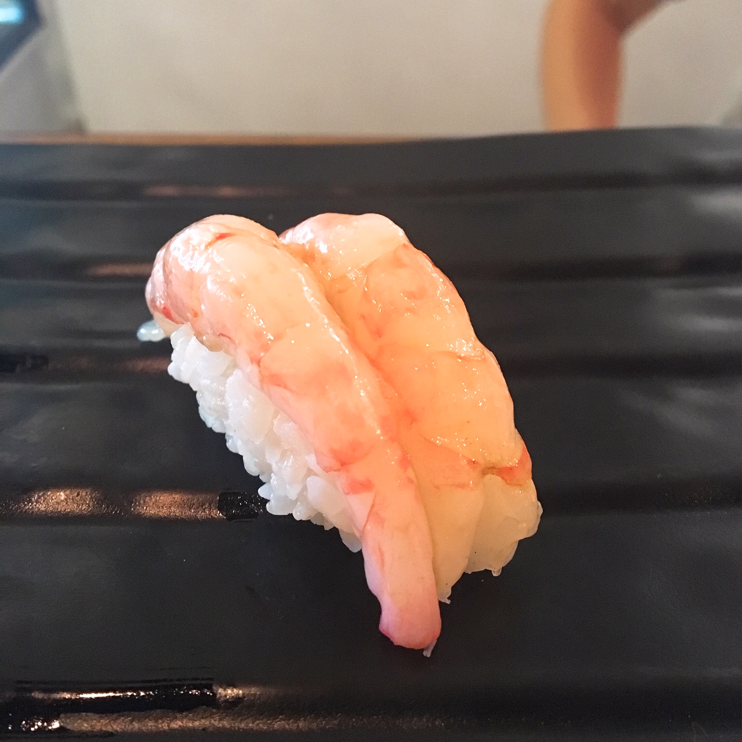 第四道上的是甜蝦握壽司,甜蝦蠻好吃的,配上一點芥末調味,層次非常豐富,甜蝦也很新鮮而且無腥味。