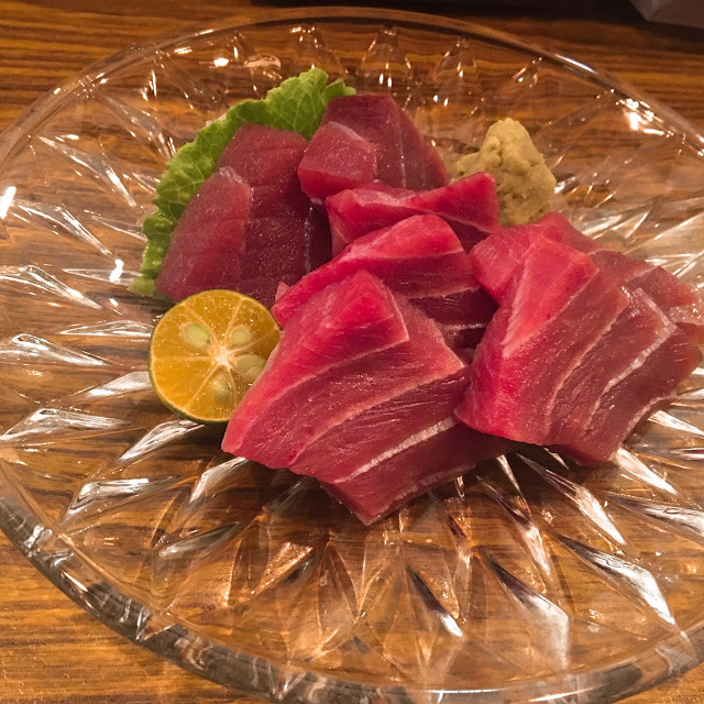 這是我另外單點的生魚片,因為店家說黑鮪魚季節快過了,就推薦我們吃看看,黑鮪魚吃起來非常好吃,油脂非常飽滿,而且沒有腥味,配上金桔來調味,味道非常棒,我個人很喜歡,其實不用加任何調味就很好吃,我很喜歡這道生魚片。