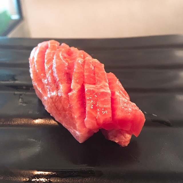 第六道上的是台灣黑鮪魚腹肉壽司,當然也是店家大力推薦的握壽司,跟三層腹肉口感不太一樣,但也是非常好吃,台灣黑鮪魚真的是蠻好吃的食材,可惜店家說產季快過了,要吃可能要等明年產季了。