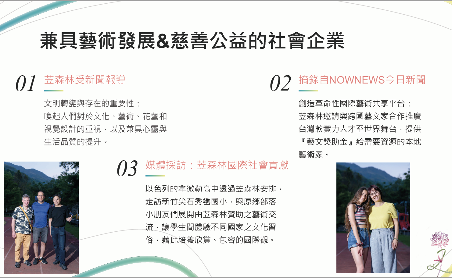 苙森林整合國際藝術與空間美學的幸福平台:以藝術展覽策劃、收藏藝術管理、花藝設計服務、廣告行銷與社會慈善的概念去挖掘和創造真正的人文價值。