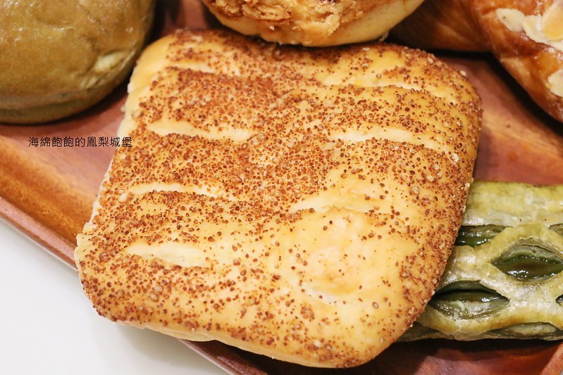 墨綠色的麵包外皮,上面還撒了一個茶字