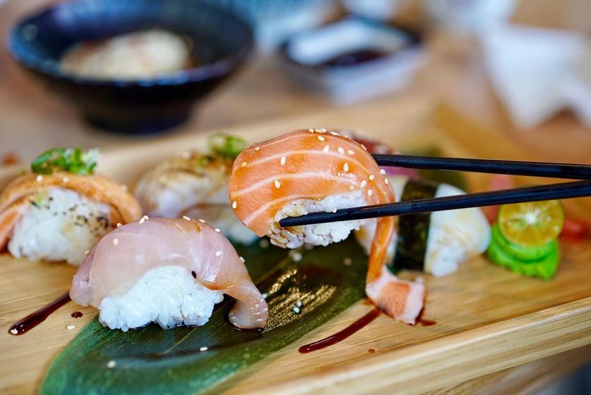再來是現點現做的「綜合生魚片」、「綜合握壽司」,綜合生魚片一上桌把我們給震驚了,也太豪華氣派了吧!吃得到鮪魚、紅甘、鮭魚、海鱺、旗魚等等生魚片,每一片都相當厚實新鮮,入口油質豐富,爽度十足,一旁也會附上金桔、哇沙比跟生山葵兩種選擇,生山葵帶點微微香氣。