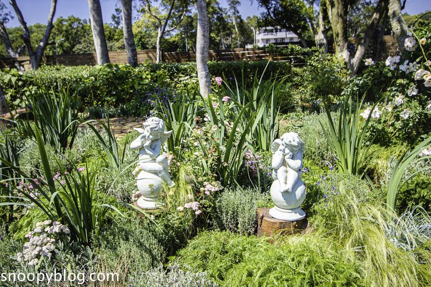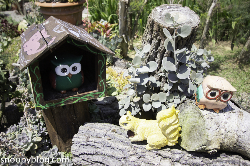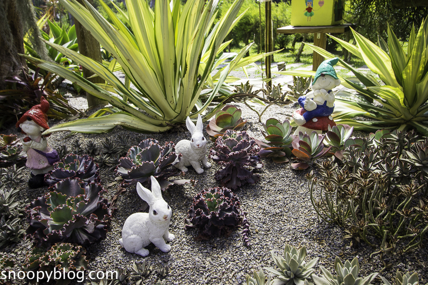 花園裡好多可愛裝飾,像是小精靈流連在花叢裡,增添童話感。