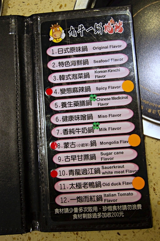 火鍋的部份共有12種湯底,紅色貼紙代表會辣、橘色貼紙代表店家推薦,