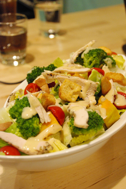 超大一船沙拉,拿來當正餐吃都沒問題,而且顏色好漂亮,有青花菜、小番茄、蘿蔓生菜、燻雞肉、麵包丁、甜椒、南瓜等,澎湃極了,而且都很新鮮。偶爾看到有餐廳端出來已變色的生菜都有點生氣,感覺很不尊重客人,但這邊的生菜切口色澤都很漂亮。