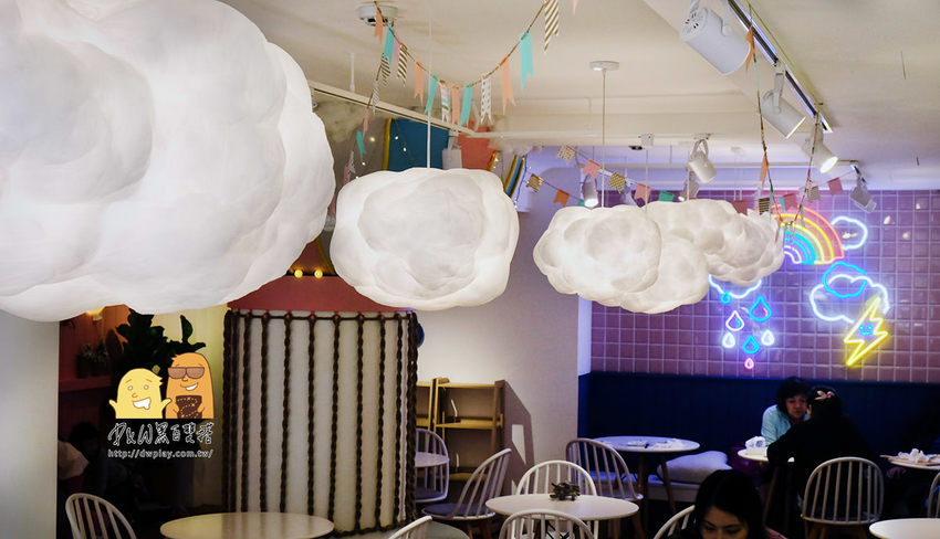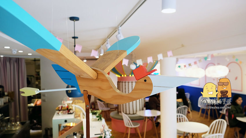 沐朵就像是糖果屋一樣,空中白白的雲朵燈還加上許多可愛的小裝飾,甚至還有木頭做的鳥兒