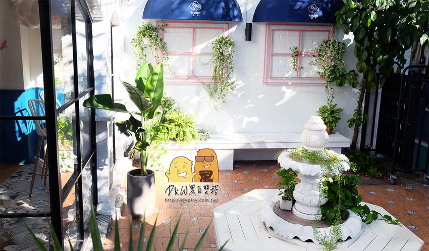國父紀念館沐朵MUDO非常寬敞,甚至還有一個像是法式庭院的空間。中央花圃在陽光灑落時,搭配白色磚牆變得像是地中海的放鬆氣息,踏入餐廳內,雲朵燈讓屋頂像是天空一樣~搭配著裝飾真的很夢幻!
