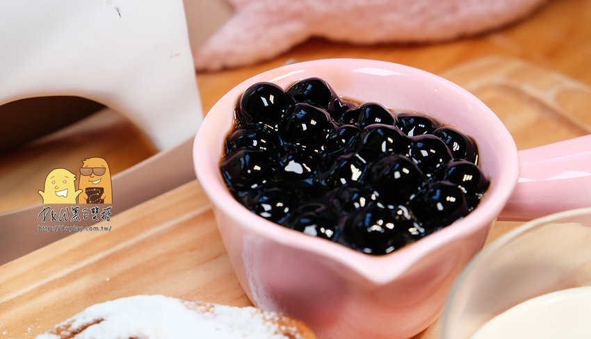 另外擺放的珍珠濕潤又有咬勁,最重要是要加上旁邊的奶茶醬~濃郁奶茶香,真的有喝珍奶的錯覺~