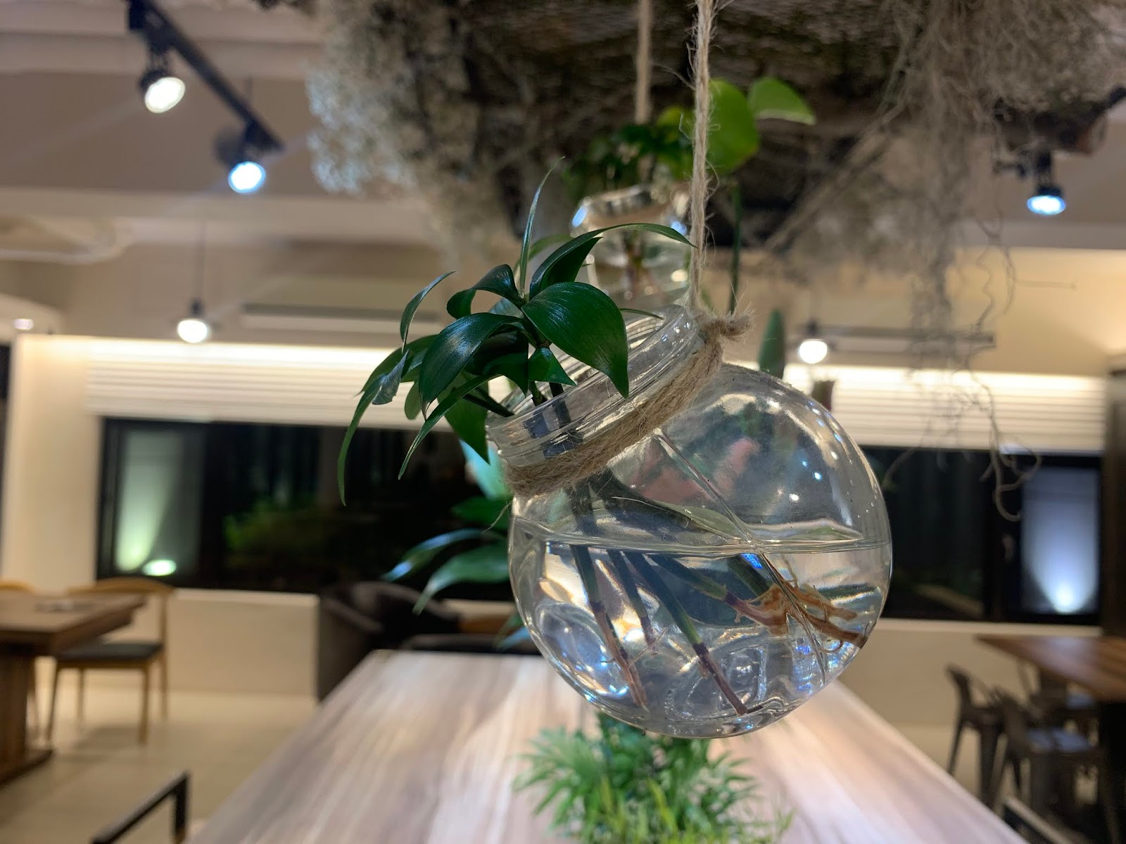 最顯眼的是位於店內中央的吧台桌椅,吧台上空掛有裝在球體花器的植物,四週再鋪上不規則的空氣鳳梨等植物增加垂吊感,讓吧台區充滿了生命力,也增添了整體用餐氣氛。