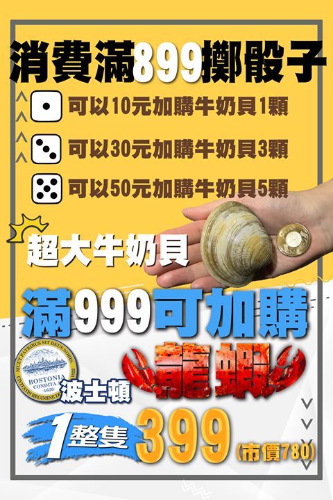 來提一下吧!即日起店家有兩個超值的優惠。除了肉品買2送1,消費滿899元就可以骰骰子,骰到3就可以用30元加購牛奶貝3顆,最多骰到6,就可以用60元加購6顆喔!消費滿999元可以用399元加購一隻原價780元的超大隻約快一斤大龍蝦,實在太划算嚕!