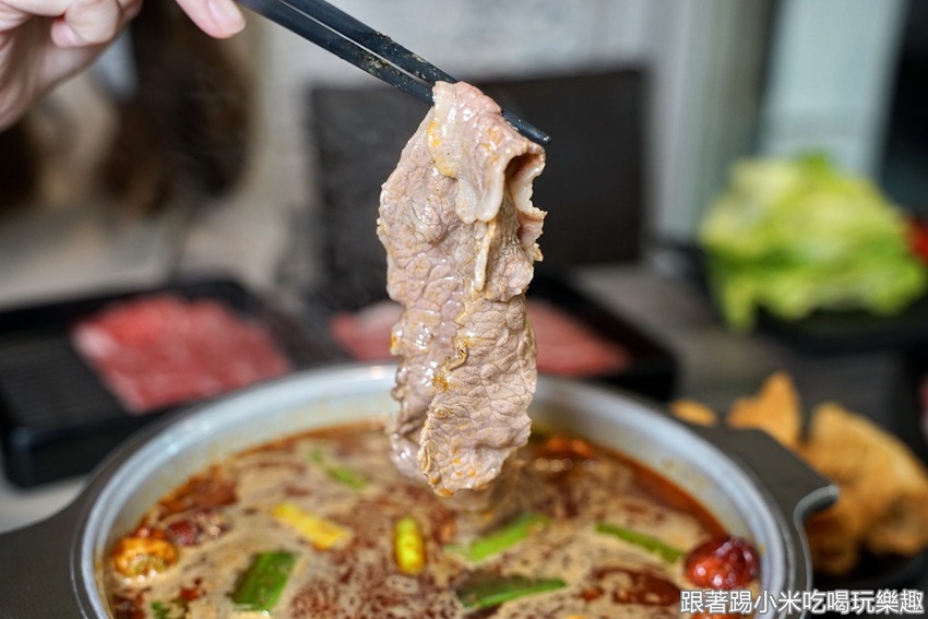 開動吧!這個就是牛小排(196元),一大盤就有這樣多油花的牛肉,真是挺划算的,只要涮個兩三秒就可以吃嚕,有著肉味融入的牛小排又有嚼勁的口感,涮個麻辣的朋友好棒棒的朋友,可以讓肉味更為明顯。