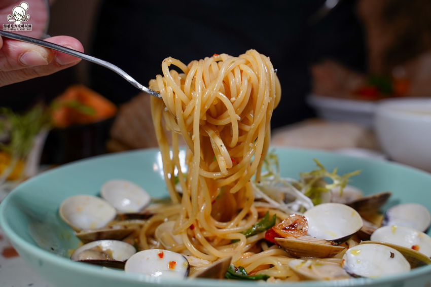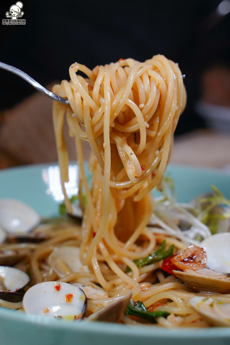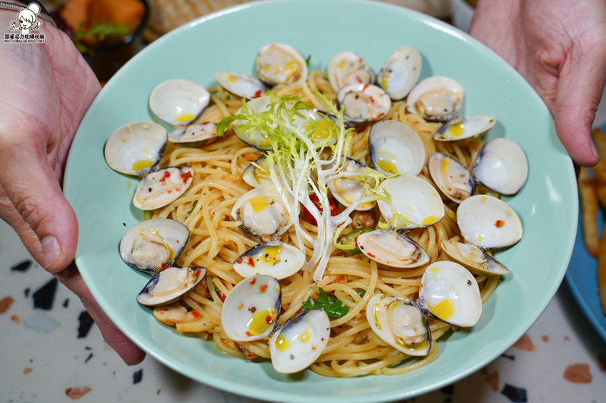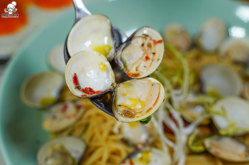 使用義大利麵 barilla 麵條,搭配新鮮蛤蠣,起鍋淋上橄欖油 Olitalia