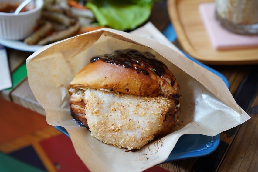 各位一定沒吃過以肉桂捲當主食的早午餐吧?那你來『吉十』就對了!以蘋果肉桂捲包覆著手摘生菜還有以數十種香料醃製的雞腿排,雞腿排非常入味,肉質鮮嫩且外皮烤得酥香,老闆建議要把醬加到裡頭一起吃,花生甜辣醬非常特別,辛辣的甜辣醬還有花生顆粒,增添了口感之外也更加開胃,重點是爽口又不膩!蘋果肉桂捲單吃就很讚了,多了蘋果泥多了些果香,吃起來更清爽,重點是這份早午餐吃完是有飽足感的。