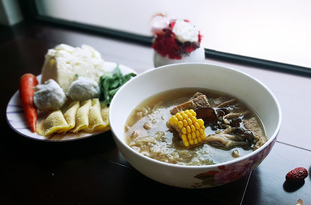基本的鍋底就有不少好料,玉米、豆皮、鴻禧菇、凍豆腐、金針菇、黑木耳、高麗菜、雪白菇,可以直接當做一道湯品上桌。