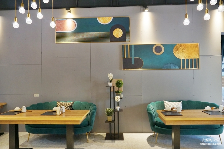 如果想要享受兩人世界,牆角的綠色沙發貝殼椅也好浪漫,椅子上還有舒適的抱枕靠墊,是說,天花板上的燈飾也好別緻喔,不同層次的亮感讓整個空間增加不少豐富度。
