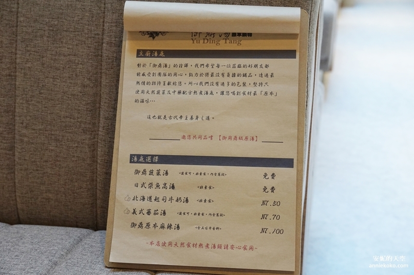 御鼎湯原本鍋物有四種湯頭,御鼎蔬菜湯、日式柴魚高湯、義式番茄湯、御鼎原本麻辣湯、北海道起司牛奶湯。