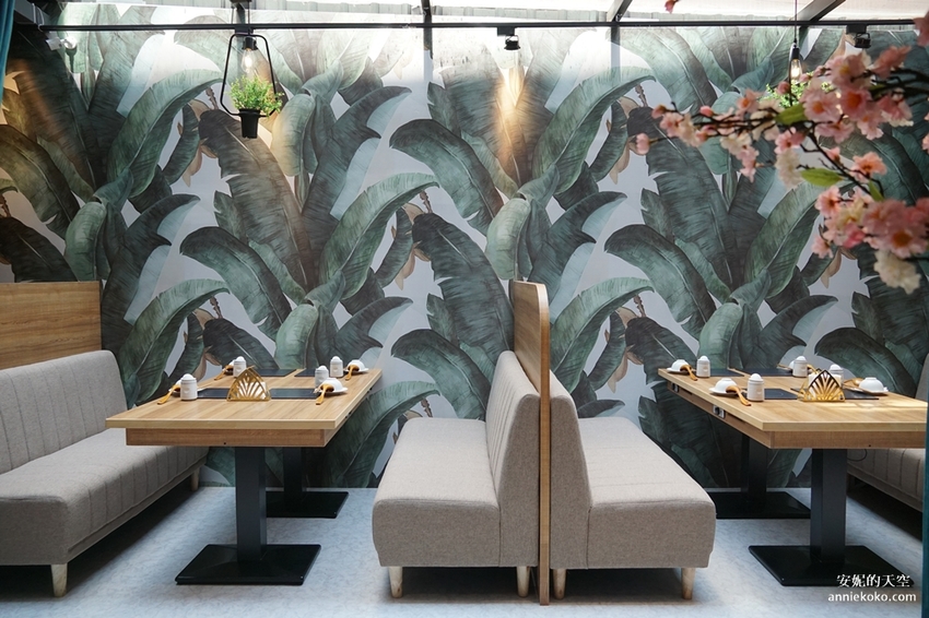 還沒結束,餐廳另一區像是半露天的用餐區,天花板有著透明層板,自然光可以恣意湧入,牆面也用了綠意植栽的壁貼,讓人有種置身在露天吃飯的情境。