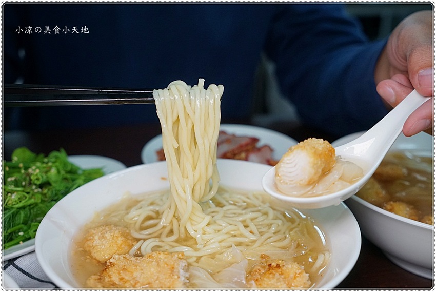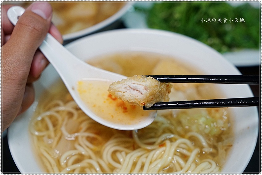 羹湯內有高麗菜、略帶濃稠的羹湯甘甜甘甜的偏南部口味,湯內有5塊炸得酥脆的土魠魚塊,麵條吃起來不會過於軟爛,滑順入嘴是有口感的,搭上魚肉的細緻,吃起來可有大大的飽足感