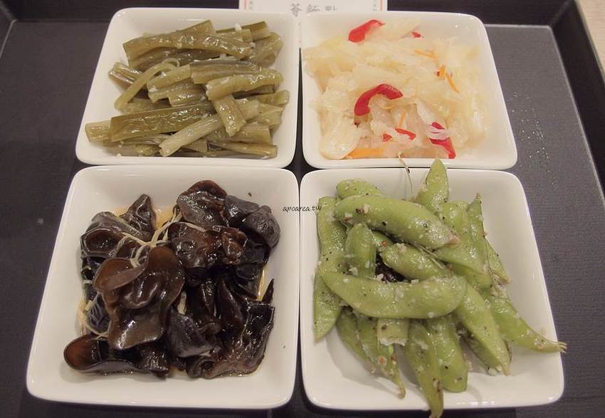 小菜我們挑了四種,台式泡菜、醋拌雲耳,風味以酸味為主,會比較開胃;黑胡椒毛豆、涼拌海帶根分別是黑胡椒香氣和蒜味較重,也是涮嘴的經典小菜。