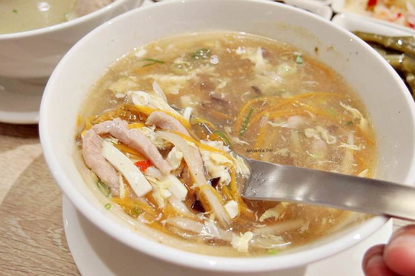 酸辣湯的料很多,有木耳、肉絲、豆腐、筍絲、紅蘿蔔和蛋花等很豐富,不過湯頭對我來說比較偏酸。然後酸辣湯配水餃也很搭,變成酸辣湯餃也不賴,蠻多人會這樣搭配^^。