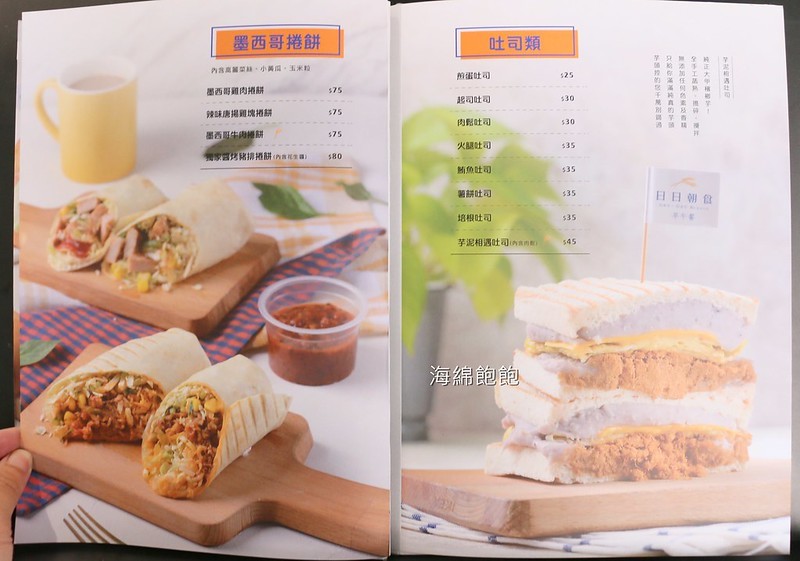 有歐式漢堡、帕瑪森潛艇堡、墨西哥捲餅、吐司、蛋餅、蘿蔔糕等餐點
