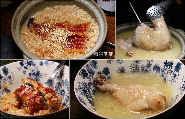 有前菜、青菜、鰻魚(雞肉)炊飯、雞湯、甜點、現打果汁
