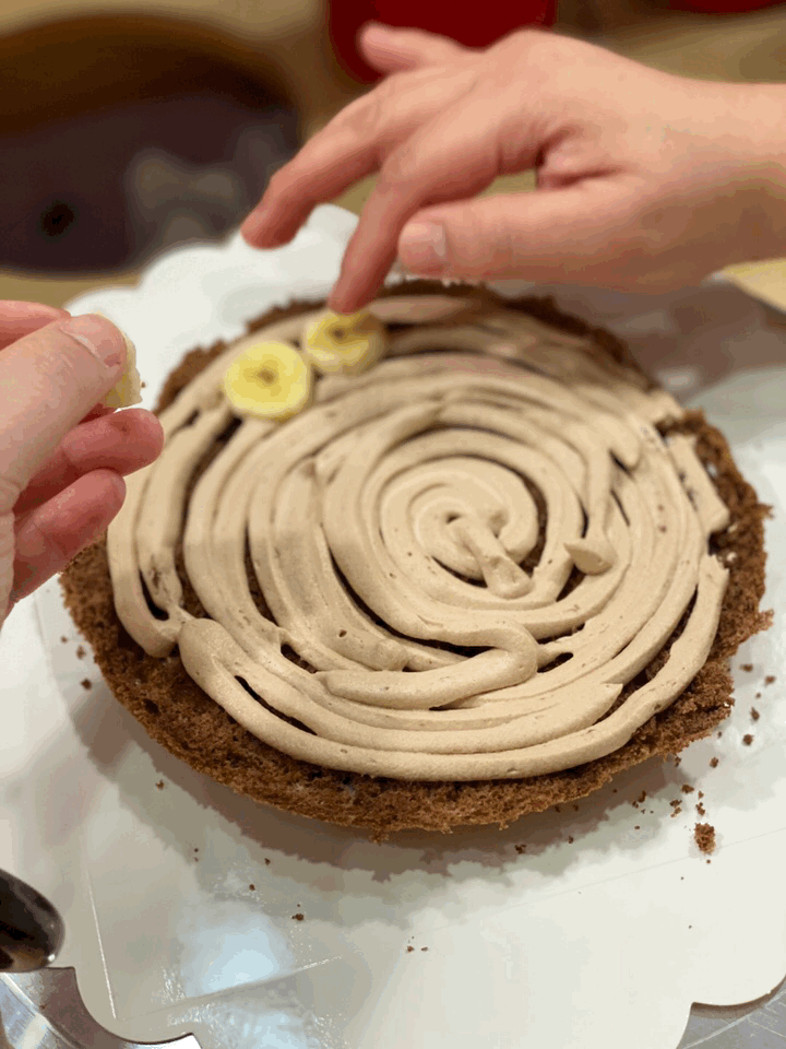 ▼擠上巧克力鮮奶油和擺放新鮮香蕉