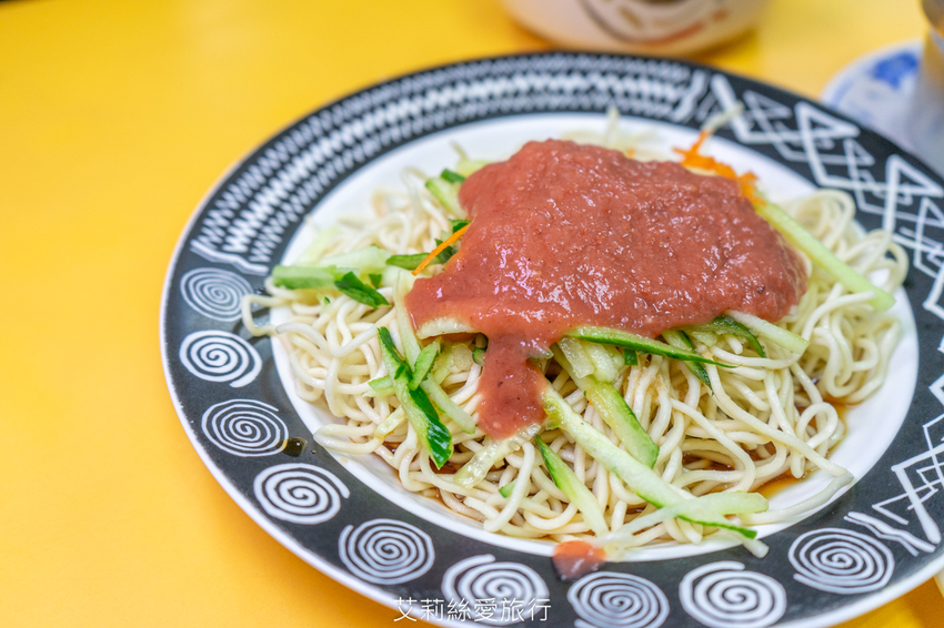 看起來紅紅的是紅麴XO醬涼麵,紅麴XO醬使用了干貝、蝦米、蝦皮、辣醬、紅麴等食材,炒過之後打成泥狀再淋在麵條上,上桌再拌入蒜頭水,XO醬聞起來充滿海鮮的香氣,店裡還有一款是黑芝麻涼麵是黑色的醬料,也很特別。