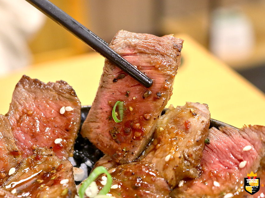 每日限量賣完提早收的丼飯專賣店, 嚴選食材現點現炙燒,使用熟成45天以上的冷藏牛排及真空醃製入味的六兩雞腿肉,再加上無化學添加的天然溫泉蛋,內用還可享免費加飯加味噌湯