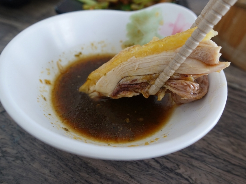 首先上的菜是白斬雞,我跟家人共四人用餐,餐點的份量也會隨著人數調整,由於苗栗是以客家莊為主,所以菜餚的部分也融入許多客家的菜色在裡面,雞肉肉質蠻鮮嫩的,搭配的是特調的油甘醬,酸甜的滋味很開胃。