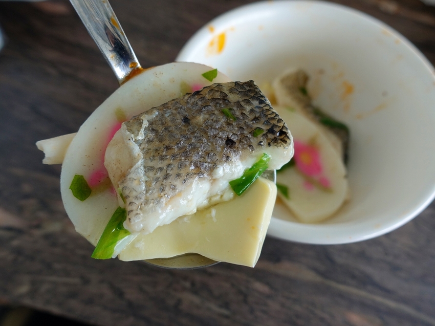 這道魚肉的料理,也讓我覺得十分新奇,切小塊的魚片搭配魚板跟雞蛋豆腐層層堆疊,裡面還可以看到小小的吻仔魚,是道很有創意的料理。