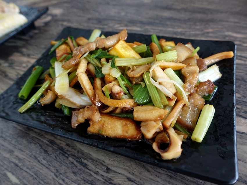 客家小炒老闆娘很自豪地要我們趕快吃看看,跟外面賣的很不一樣,整體的口感很清爽不油膩。裡面還有加入地瓜條,真的是超級酷,搭配經典的豬肉跟魷魚,在客家的傳統口味不失傳承精神也多了一層創新。