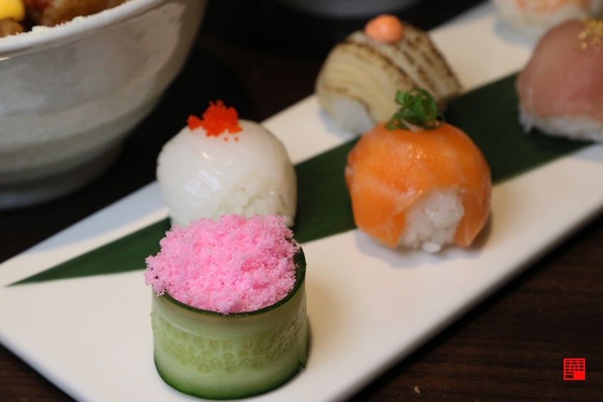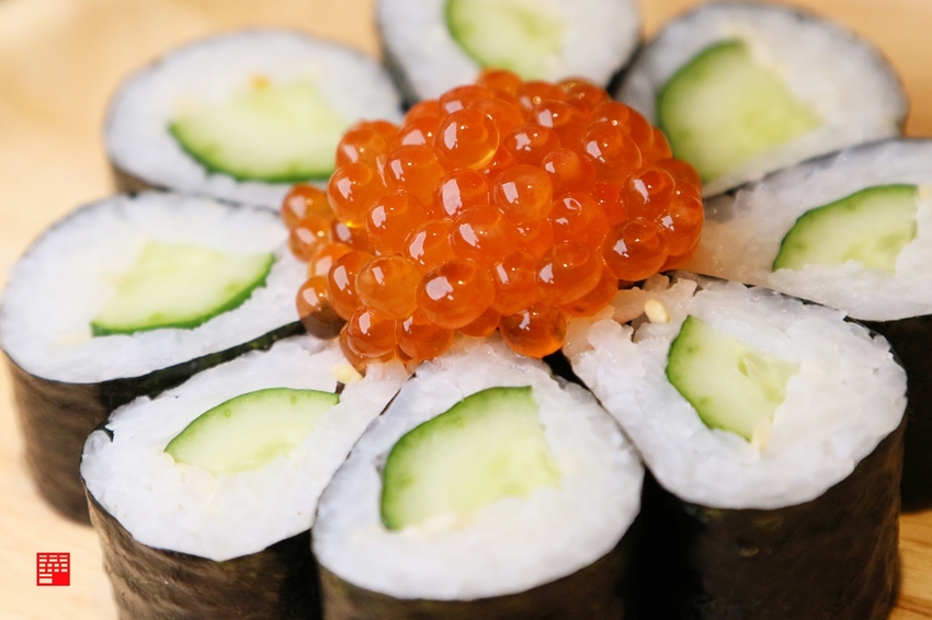 簡單精緻的一道料理,但老闆會依時節(春、夏、秋、冬)作出四種不同的搭配,如最近天氣逐漸轉熱,老闆便選用醋飯包覆清爽的小黃瓜,搭配具香氣又有口感的鮭魚卵,希望客人把他的用心給吃進去。