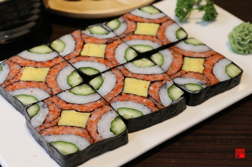 讓我眼睛為之一亮的菜色,走遍台灣南北,大多是日式料理都是強調軍艦壽司、握壽司、捲壽司,但這款強調刀工又富營養均衡(食材包括小黃瓜、蛋、紅魚子等)的繽紛花窗壽司,真的是又好拍又好吃,老闆跟我透露,這款壽司的發想,其實來自於老屋的花窗,在在顯現出嘉義人的在地精神。