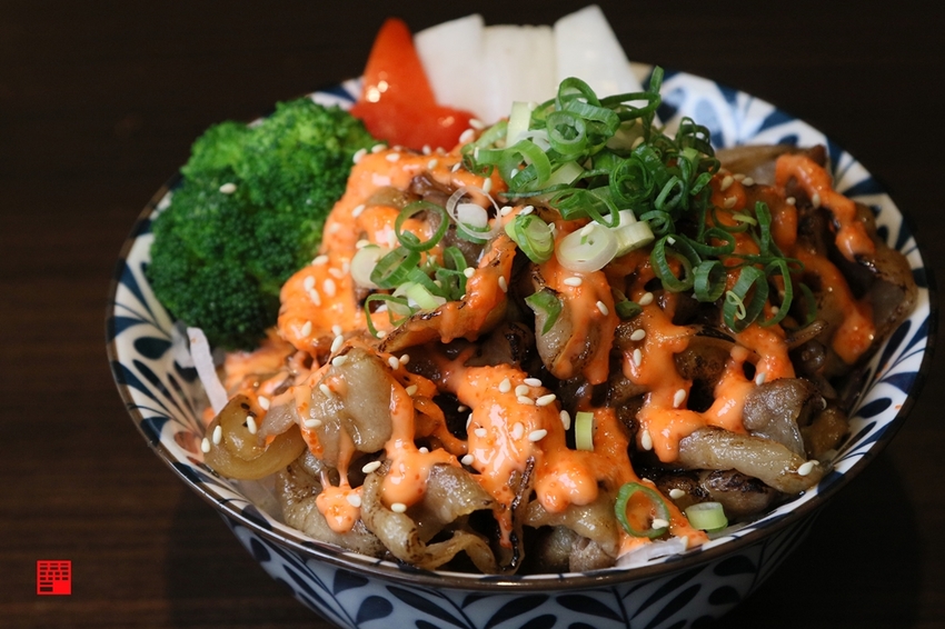 丼飯最注重的靈魂非醬汁莫屬,花樂食堂的食用醬汁也是手工特調,聞起來有點橘子跟蘋果的香氣,搭配豬五花跟洋蔥,上桌後再淋上日本明太子跟美乃滋合在一起的明太子美乃滋醬,再炙燒一次引爆香氣,根本人間美味。